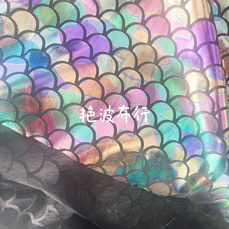 弾力レーザー箔押し魚鱗生地ポリエステル底幻彩人魚舞台服装ハロウィーンマント生地