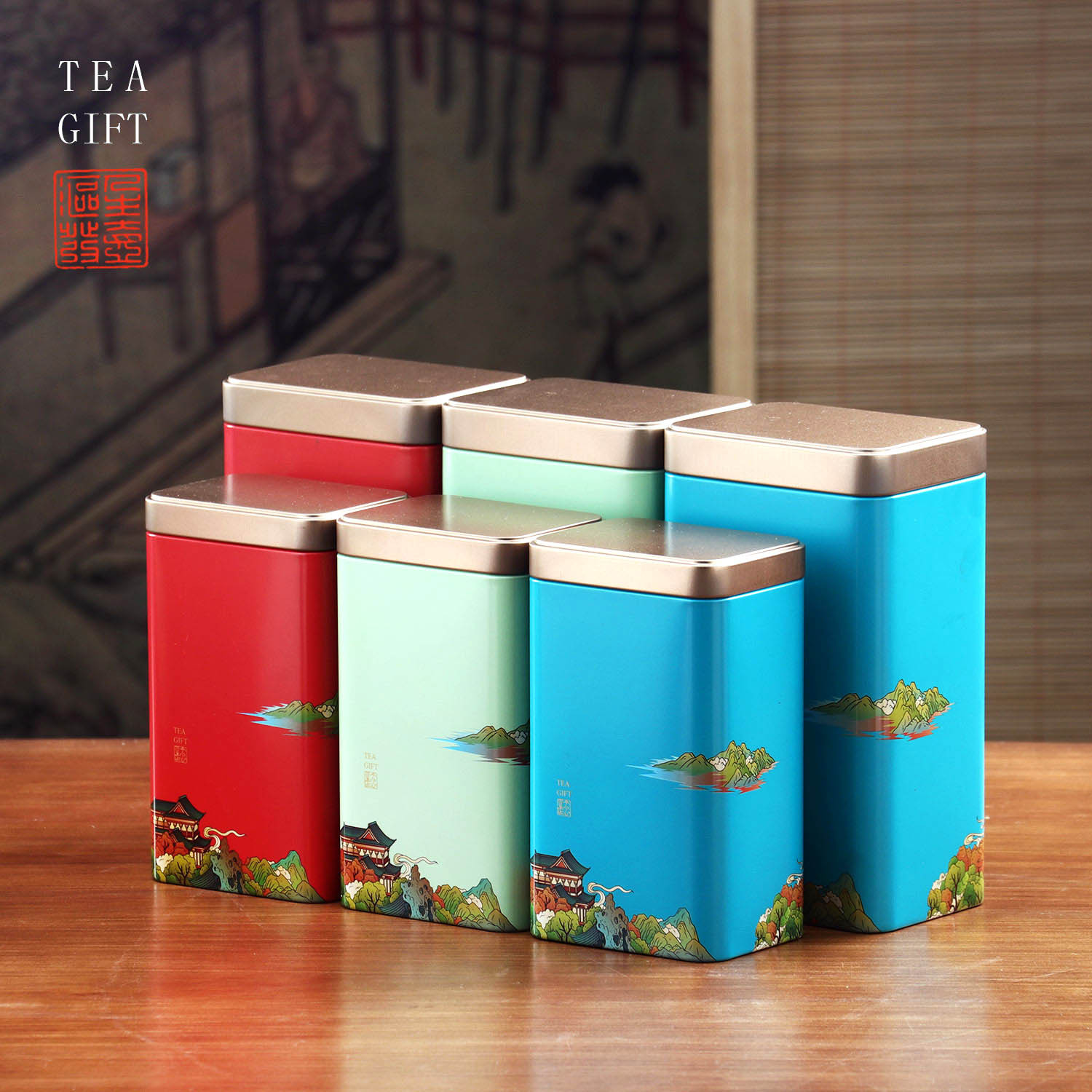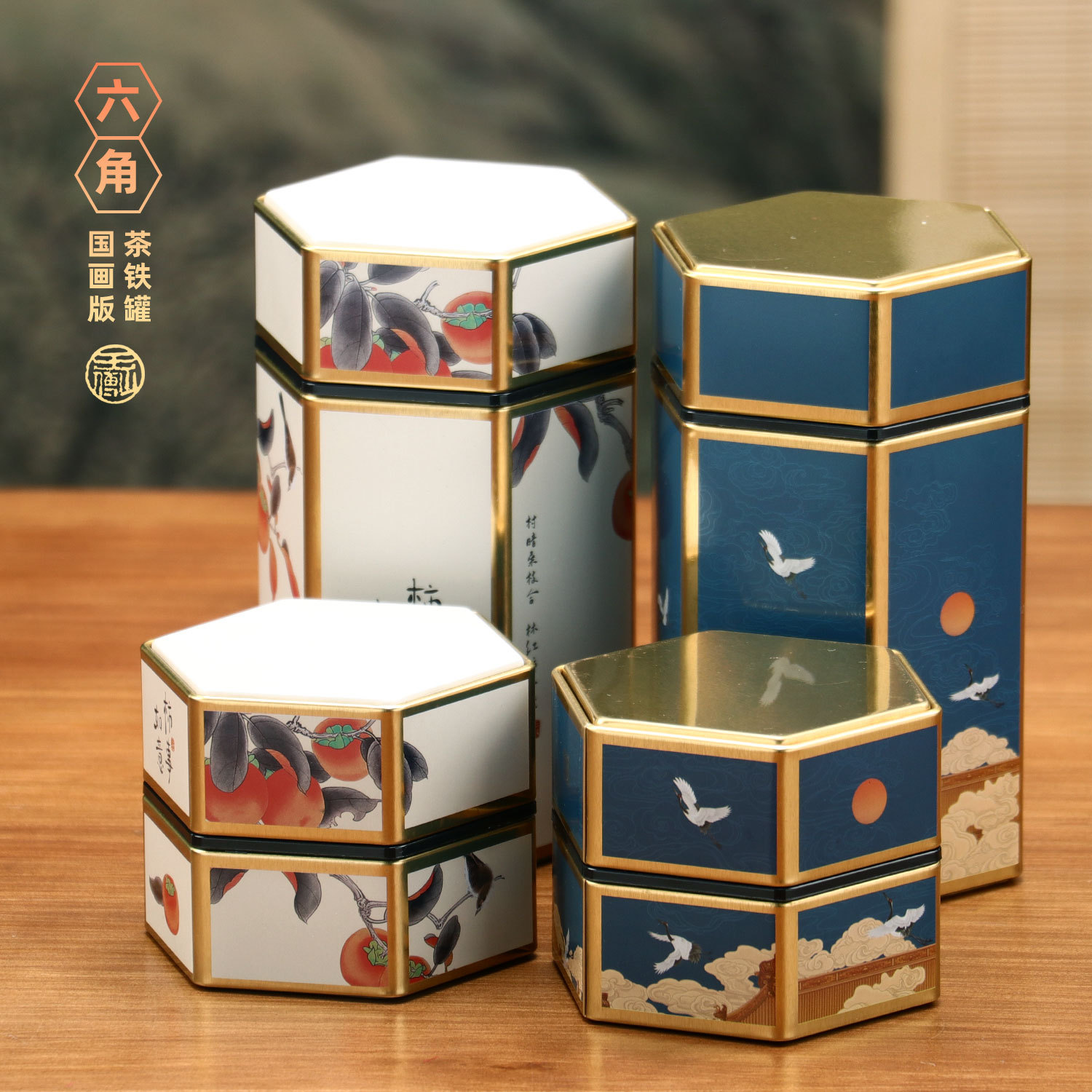 新商品創意六角形茶葉缶国画ブリキ缶通用紅茶緑茶花茶精致空缶