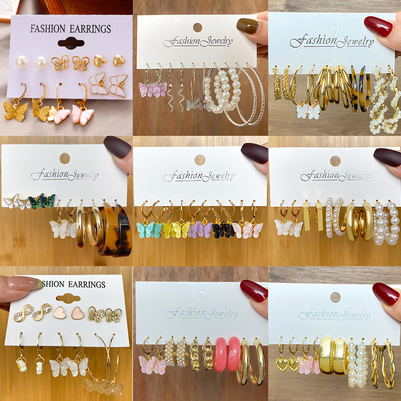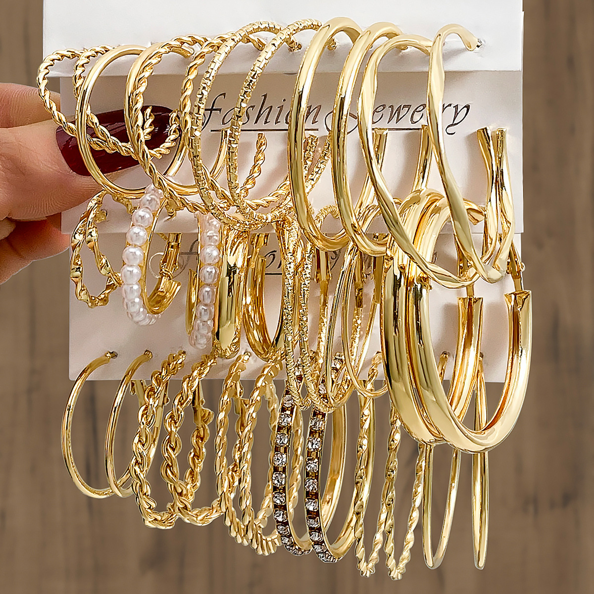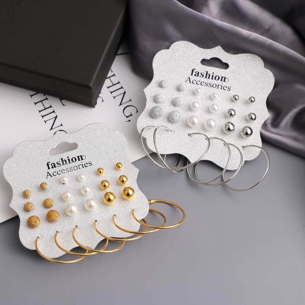 欧米のクロスボーダーの大げさな真珠のピアスの幾何型の円はドリルの合金の耳飾りの12対のセットの輪のイヤリングを持ちます。