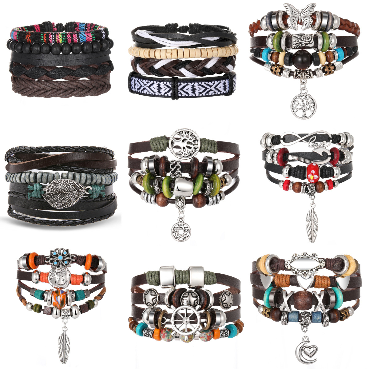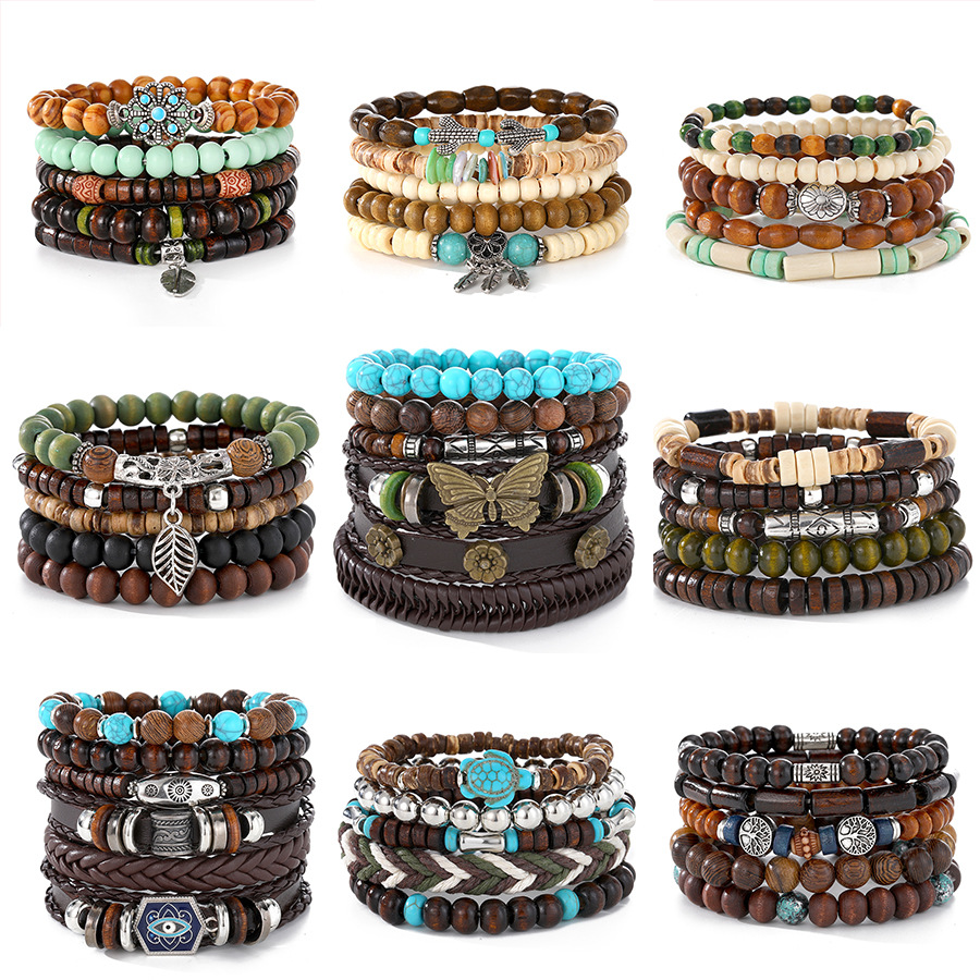 クロスボーダーボヘミアンファッション多層ココナッツシェルビーズブレスレットレトロバタフライメンズレザー編み込みブレスレットセット