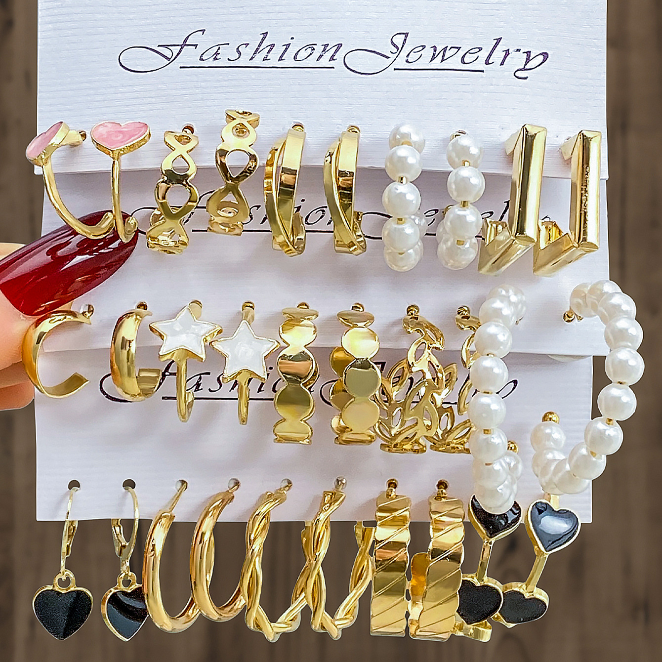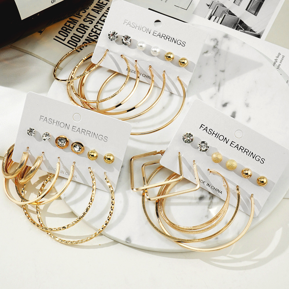 欧米の国境を越えて真珠をはめ込んだ女性カードのイヤリングのアイデアフランスのレトロな金色の耳輪セット6点セット