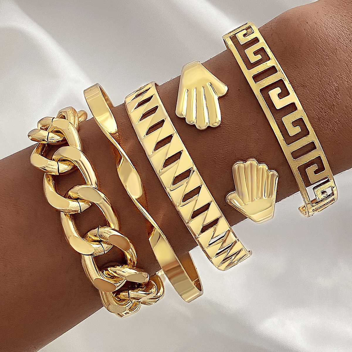 義烏アクセサリーロットブレスレット回形紋女性レトロ透かし彫りC字形開口5点セットブレスレットセット合金