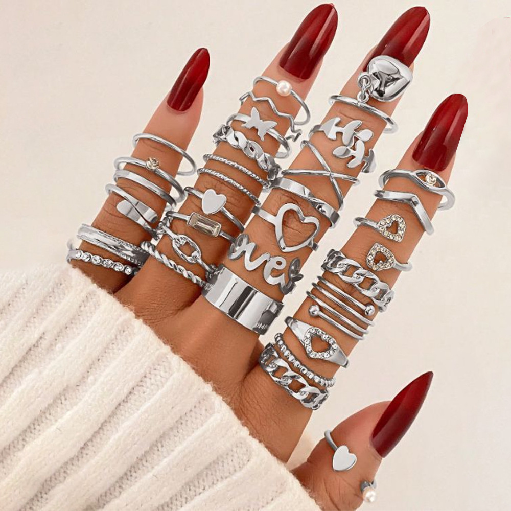 ヨーロッパとアメリカのインスタイルリング女性のための不規則なファッションラブペンダントスクエア27ピースパーソナライズされたオープンリングセット