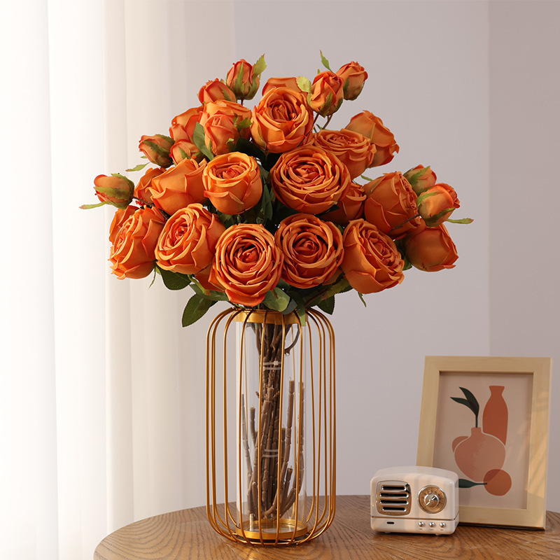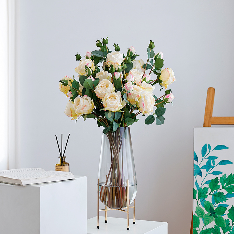 バラの花束の偽の花のヨーロッパ式の3頭の焦げた辺のギリシャのバラの客間の美陳の撮影の置物の花の芸の置物をシミュレーションします。