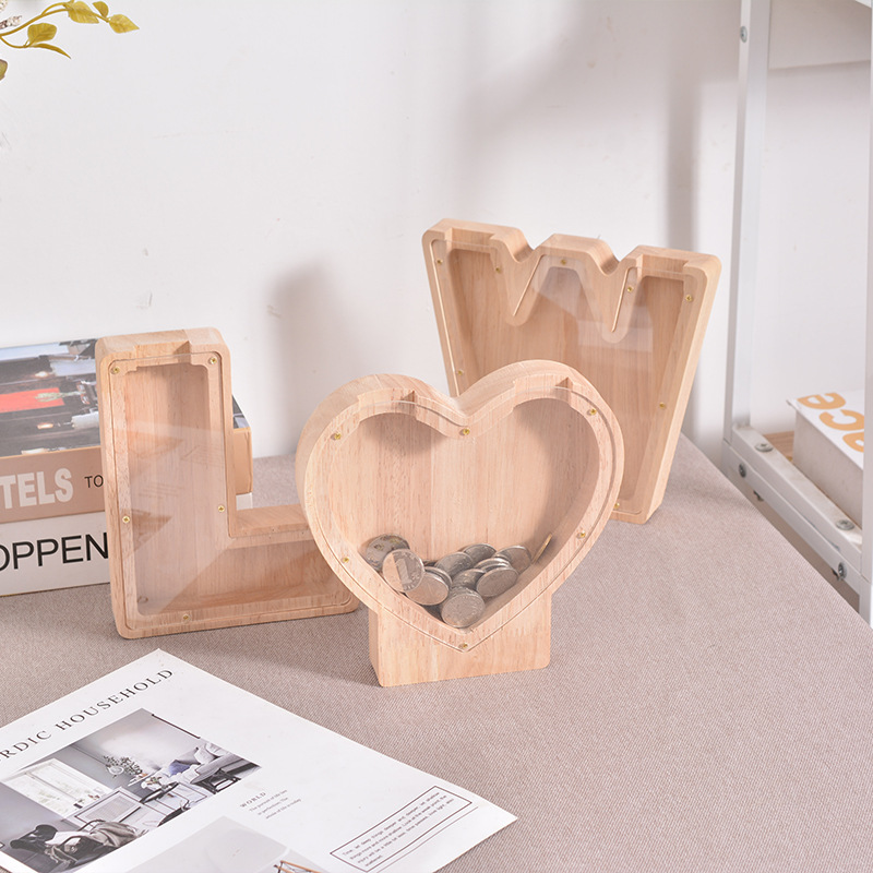クリエイティブ新型ハート型貯金箱実木家庭用貯蔵タンク透明アクリル板ゴム木起爆貯金箱