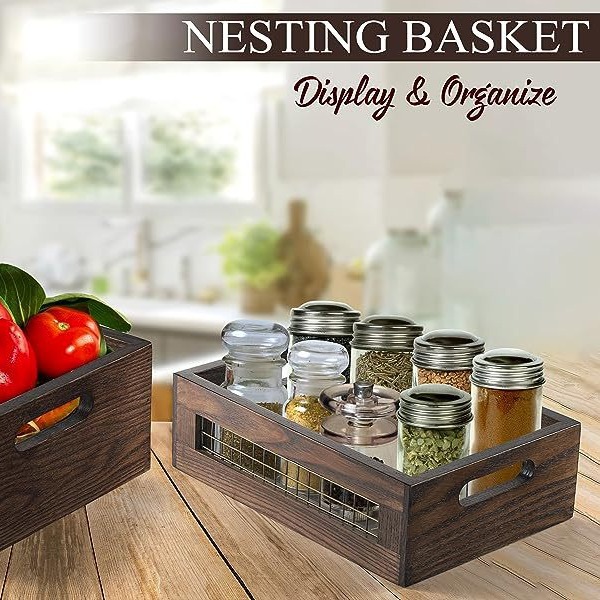 デスクトップ木製収納バスケット取っ手付き木箱果物野菜収納バスケット化粧品整理バスケット木製収納ボックス