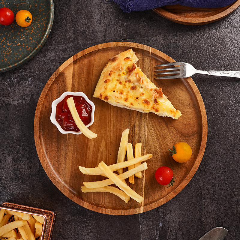 アカシアの木のトレーの木の食事皿ins風ピザステーキの木の皿のケーキのパンの午後のお茶の果物の皿の円形