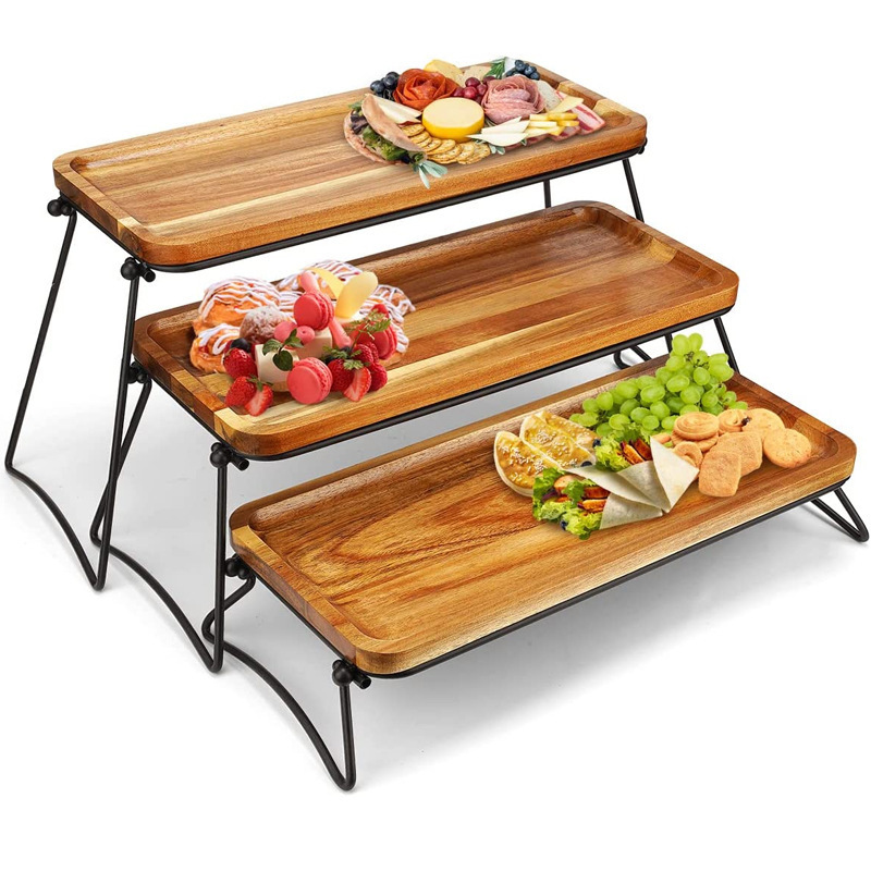 アカシアの木のトレーのパーティーの会食のテーブルのお菓子は台の携帯式のピクニックのトレーの屋外の折り畳みできるの棚を並べます。