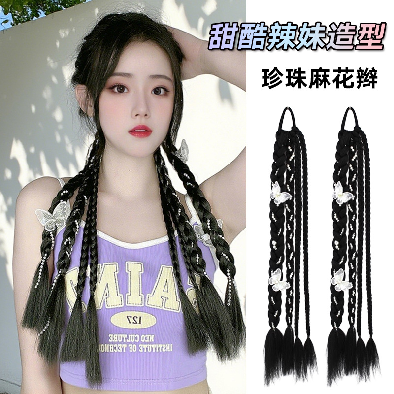 Y2kかつらのお下げの子供のギャルの汚いお下げの双ポニーテールの化繊のシミュレーションは真珠のチェーンのボクシングのお下げの卸売りを編みます。