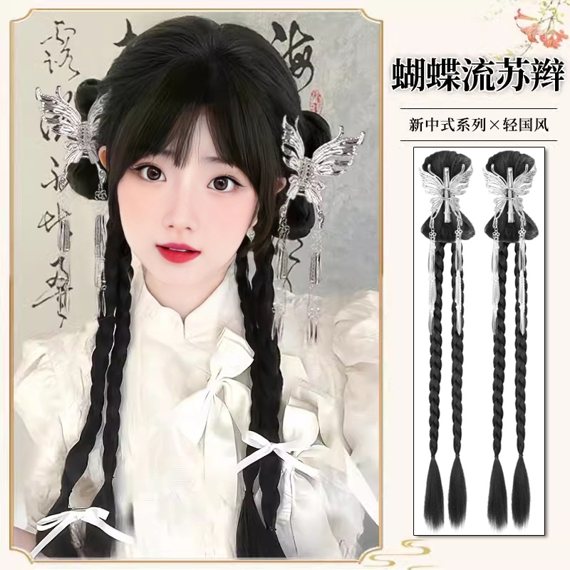メーカーの現物のかつらのお下げの子供の新しい中国式の蝶のフリンジクリップは麻のお下げの国風のポニーテールの卸売りを編みます。
