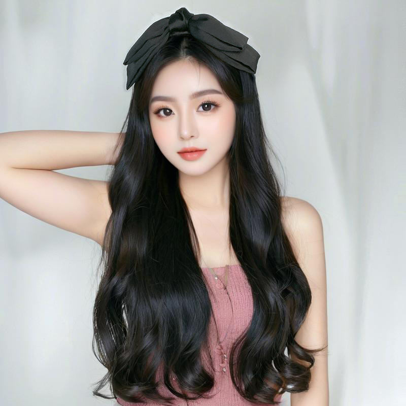韓国黒リボンヘアフープウィッグ女性用人工毛ビッグウェーブロングカーリーヘアハーフヘッドギアメーカー即売