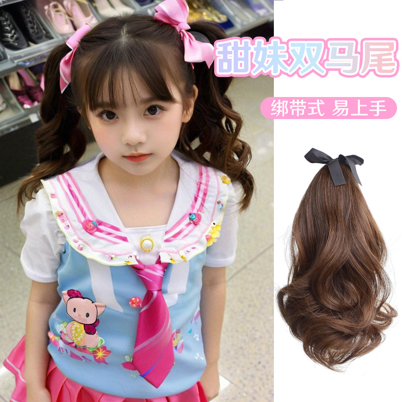 子供用ダブルポニーテールウィッグ女性プリンセスストラップオンナチュラル人工毛ロングカーリーポニーテールメーカー在庫卸売