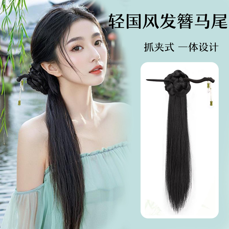 新しい中国風のかつら三つ編みポニーテール女性の人工毛ストレートヘアライト中国風クリップサイドポニーテール古代スタイルの漢服チャイナドレス頭飾り