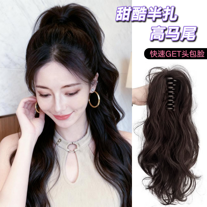滝のカールの半分は高い馬尾のかつらを刺します。女性は挟み式の鶏の巣の団子の頭をつかんで、髪の毛の噴水の馬尾の卸売りをシミュレーションします。