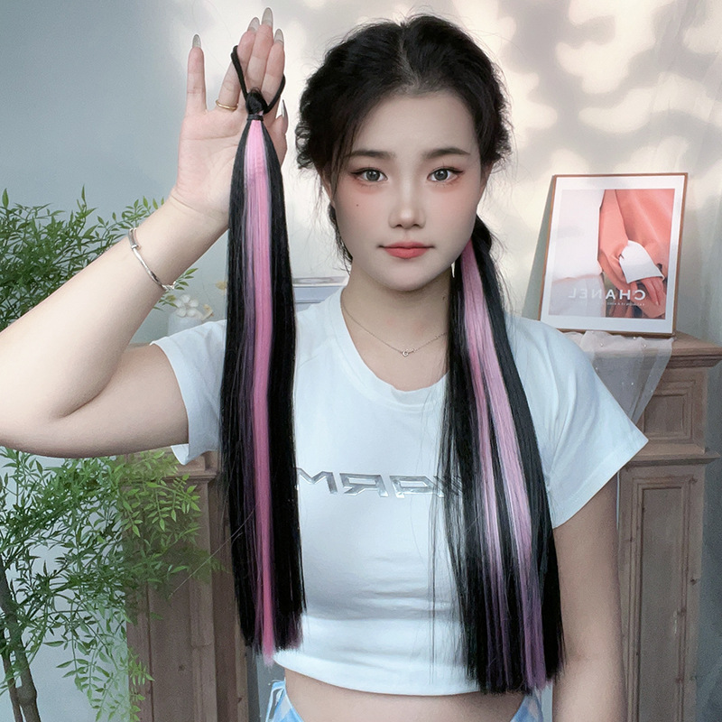 ポニーテールウィッグ三つ編み女性ドーパミンセルフ巻きボールヘッドハイライトカラーヘアバンドルロングヘアダブルポニーテール工場直販
