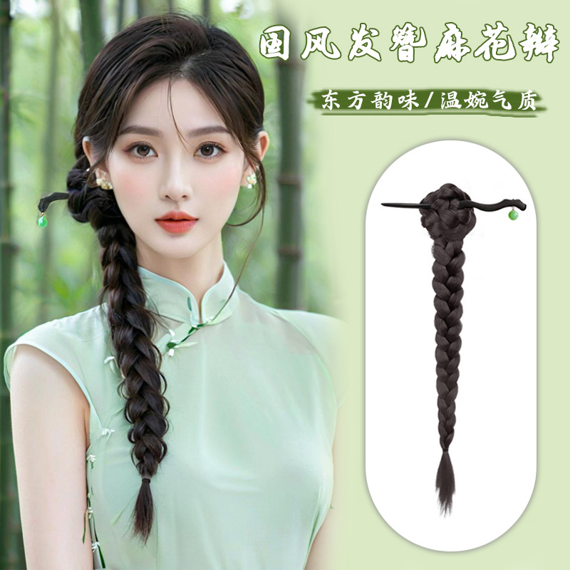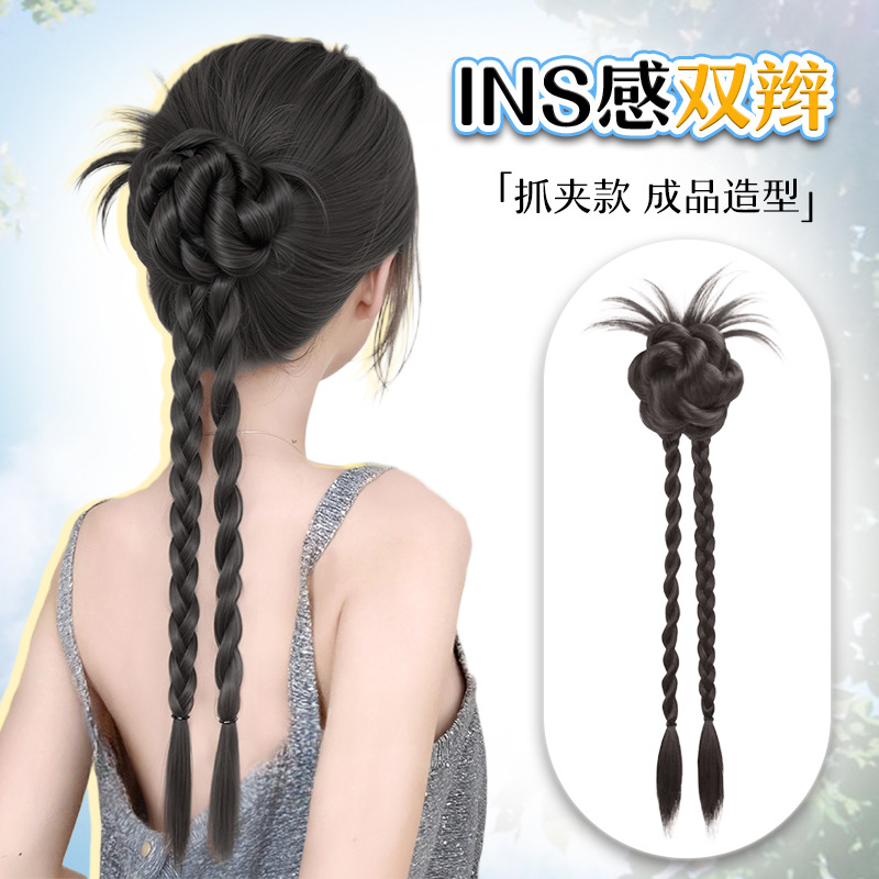 女性用古代風ミートボールヘアウィッグ、新しい中国風のクリップ、ツイスト三つ編み、つぼみヘア、後頭部の人工ヘアパッケージ