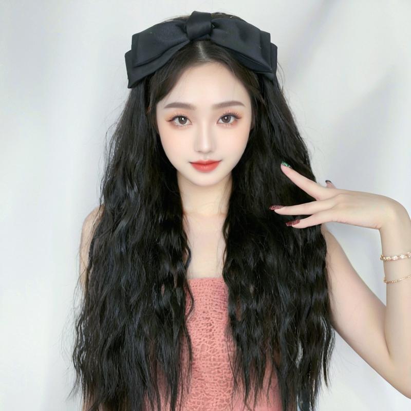 Shein クロスボーダー卸売黒大きなリボンヘッドバンドかつら女性の水の波紋ロング巻き毛ハーフヘッドギアサプライヤー