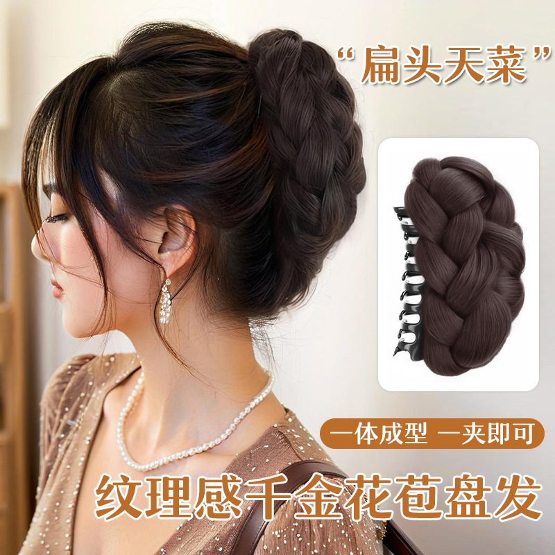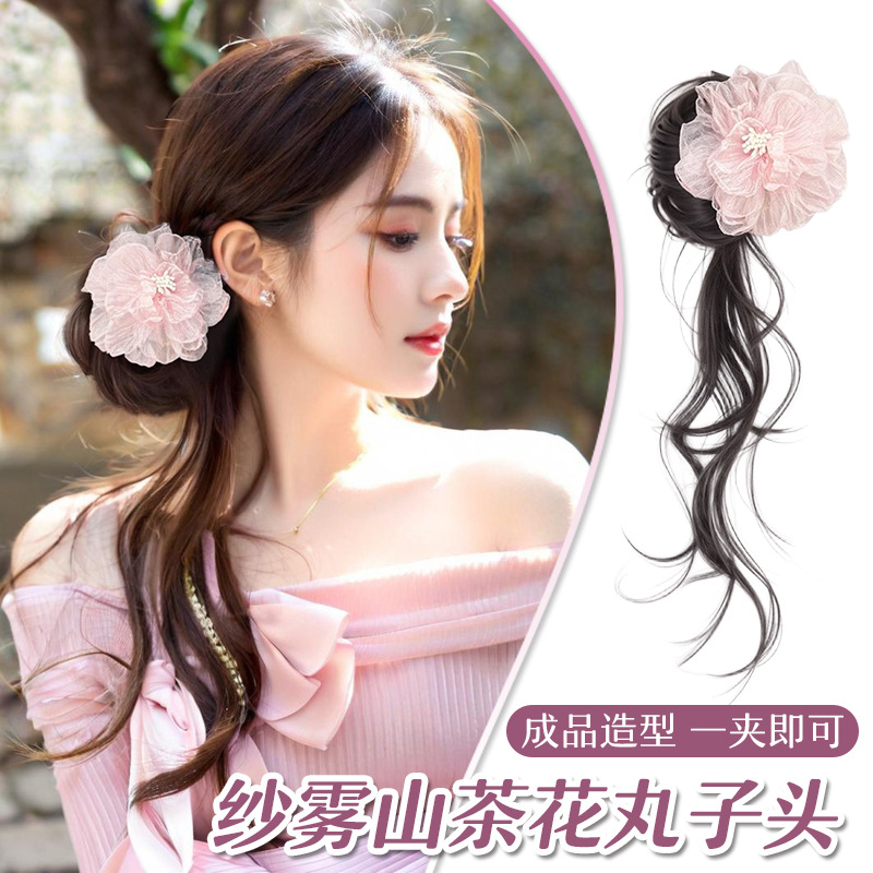 Douyinの人気の女性用ボールヘッドウィッグ、クリップオンリボン、フラワーバッドヘッド、後頭部のフラットヘッドヘアバッグ、メーカー卸売