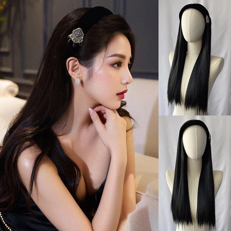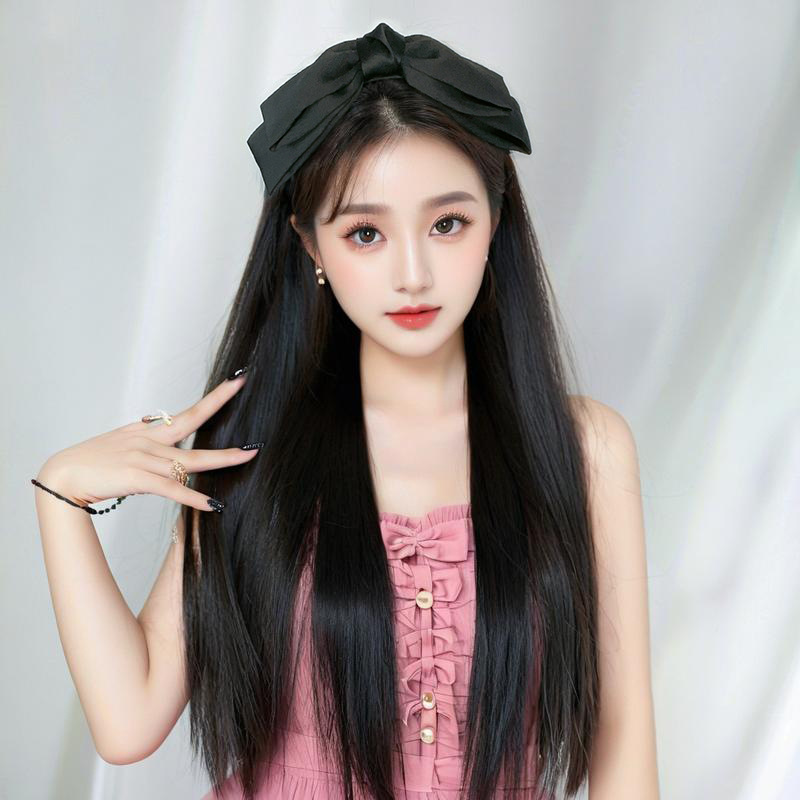 Douyin 人気の黒リボンヘッドバンドかつらオールインワン女性模擬ロングストレートヘアハーフヘッドギアソース工場卸売