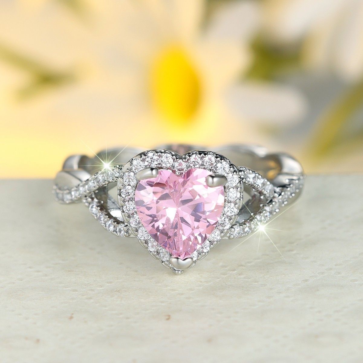 ヨーロッパとアメリカのラウンドラブピンクダイヤモンドエッジホワイトダイヤモンドハート型リング、軽い贅沢、エレガント、ハイエンド、甘い、日常的で多用途