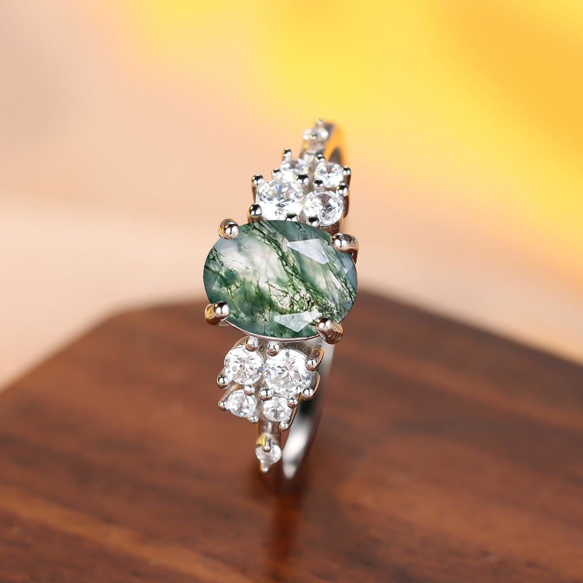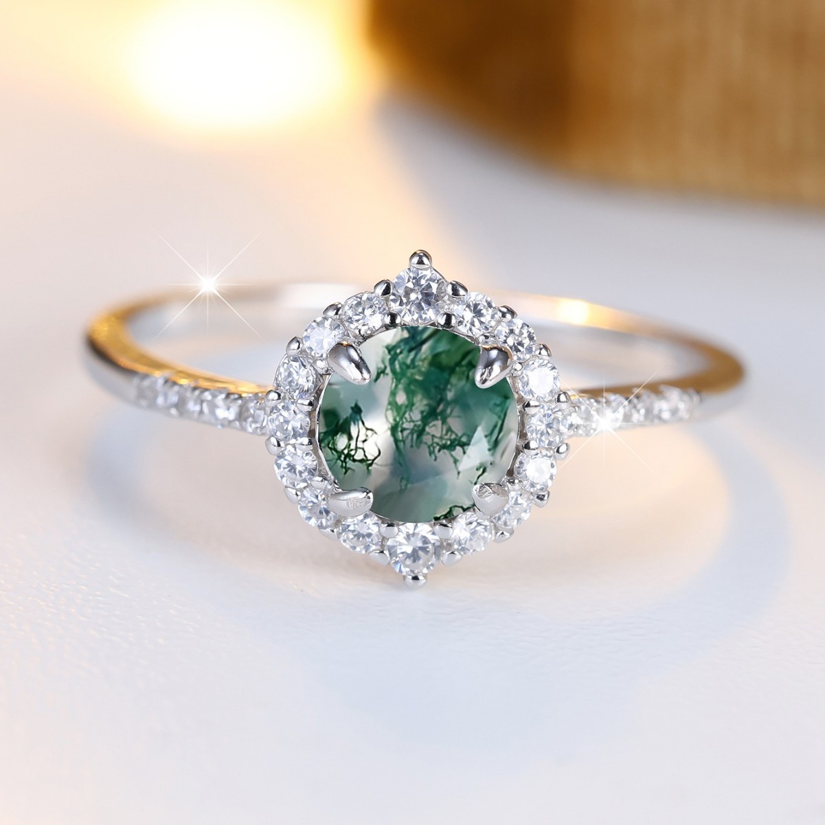 国境を越えた独特の魅力S925純銀円形水草メノウ指輪緑コケファッション欧米大気手飾り