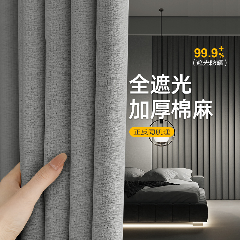グレーの遮光カーテン 2025 新しいスタイルの寝室の雰囲気のリビングルームライト高級サンシェード綿とリネン柯橋フックタイプフルクロス