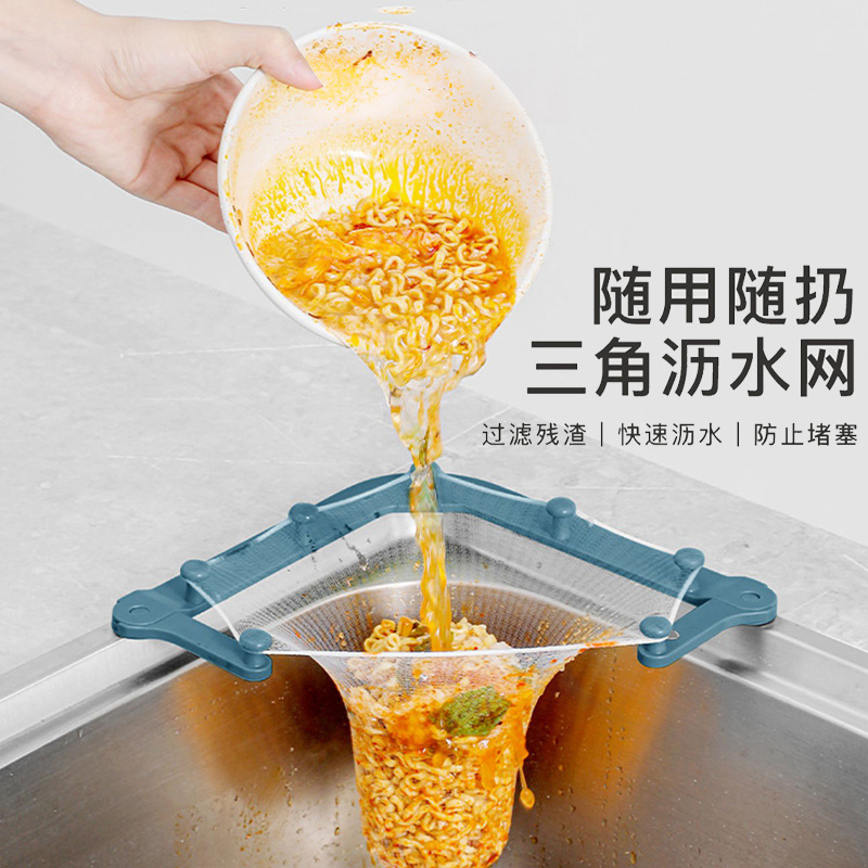 台所の水槽の濾過網の中の逆の三角の残り物の水切り棚の網の水切り棚の池の残滓の野菜の濾過網