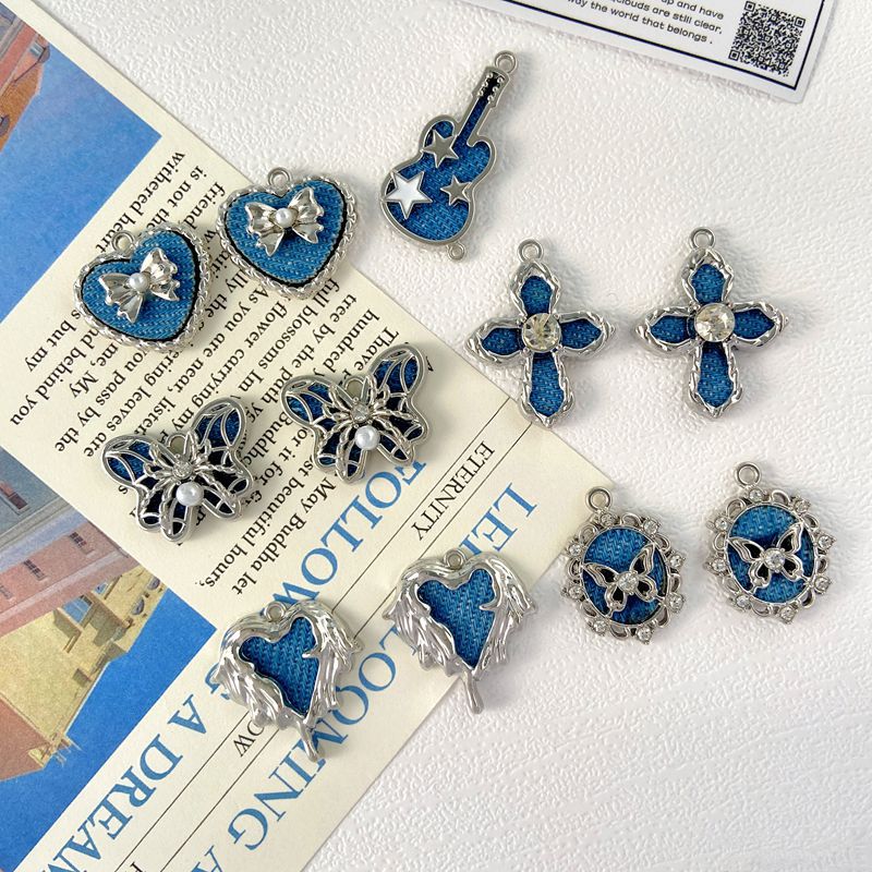 スイートクールデニムブルーラブバタフライクロスギターペンダント diy 手作りビーズブレスレットネックレスイヤリングアクセサリー