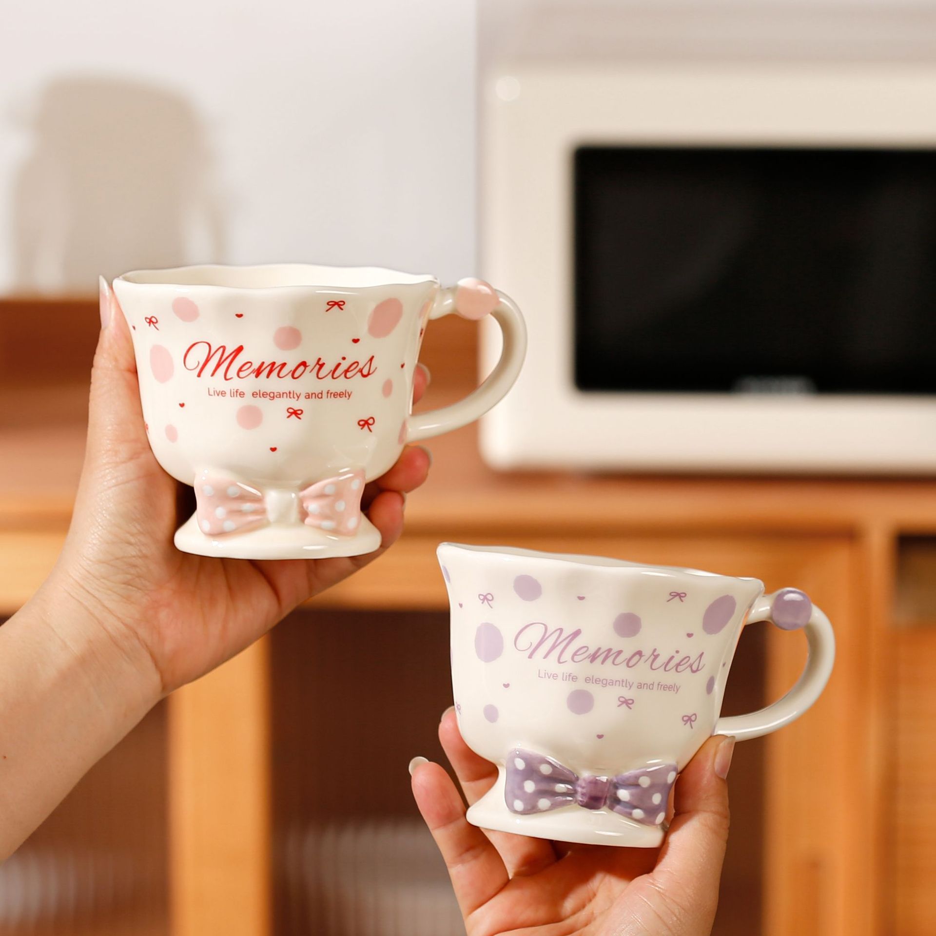 かわいい高颜値蝶結びマグカップ釉薬下彩陶磁器カップ家庭用水飲みカップスプーン付き誕生日プレゼント女