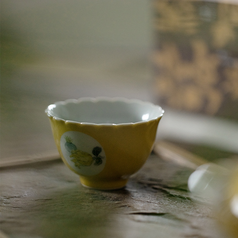 景徳鎮製、落書きなし、黄色釉薬のパステルカラーの手描き菊模様の個人用ティーカップ、花口カップ、カンフーティーセット、ティーカップ