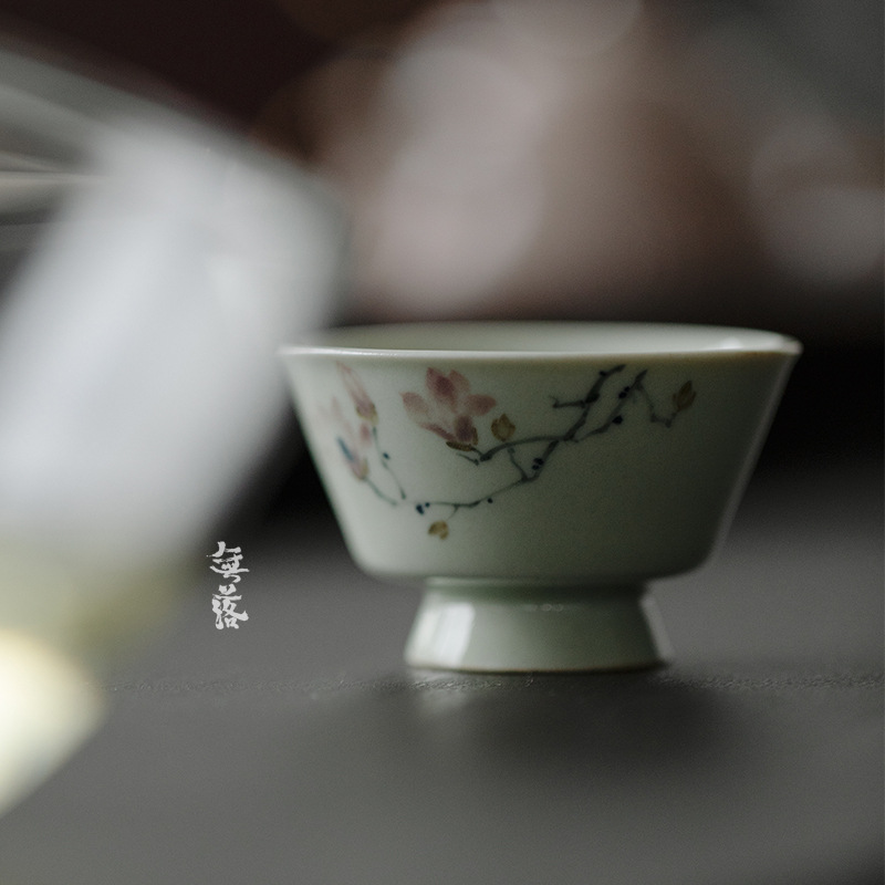 落果なし青釉薬下粉彩手描き玉蘭林照小品杯工夫茶器手描き蘭品茗杯
