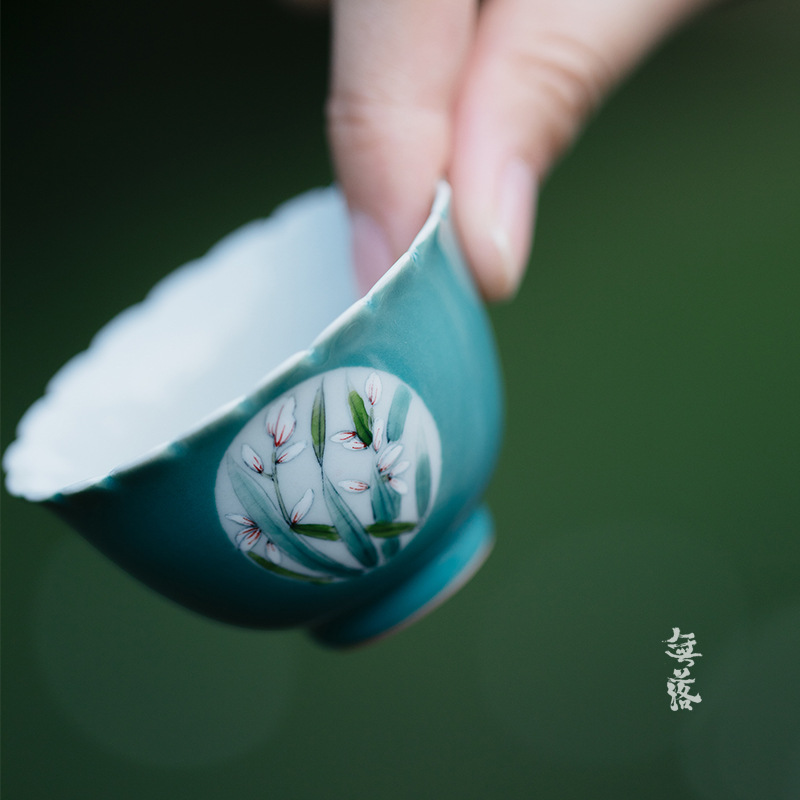 無落景徳鎮中式黛緑釉薬開窓手描き青緑水菊口カップ花口カップ小物茗杯
