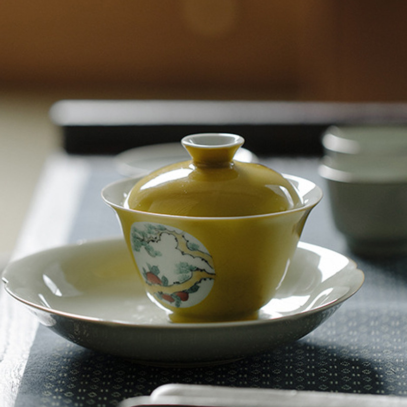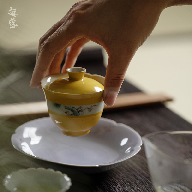 無落景徳鎮拓黄釉留白開窓精工手描き寒梅飛落花口蓋碗工夫茶器