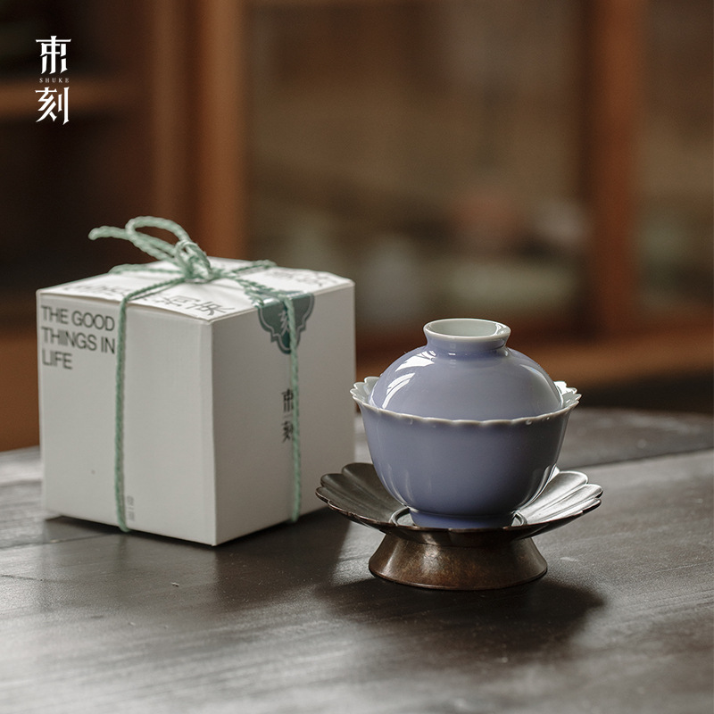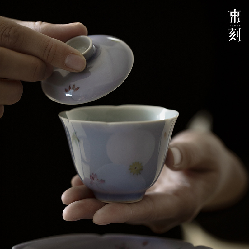 束刻木槻紫菊口三才蓋碗日本式シンプル泡茶碗工夫茶具手作りの薄いタイヤのお茶碗