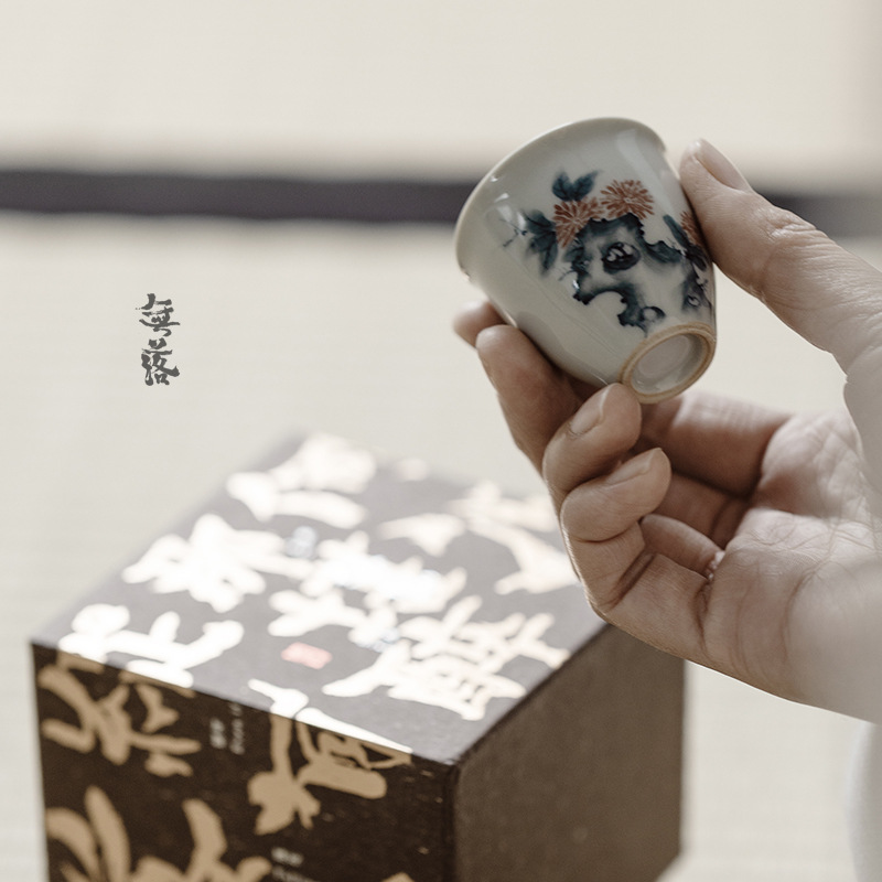 落果なし青釉薬下パステルカラー手描きデイジー知記憶カップ銀口小品カップ工夫茶道具シングルカップ