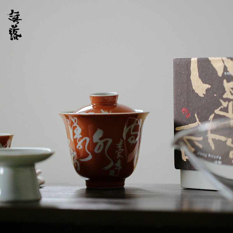 無落景徳鎮紅手書き詩文留白春山影工夫茶器蓋碗手作り薄胎茶器
