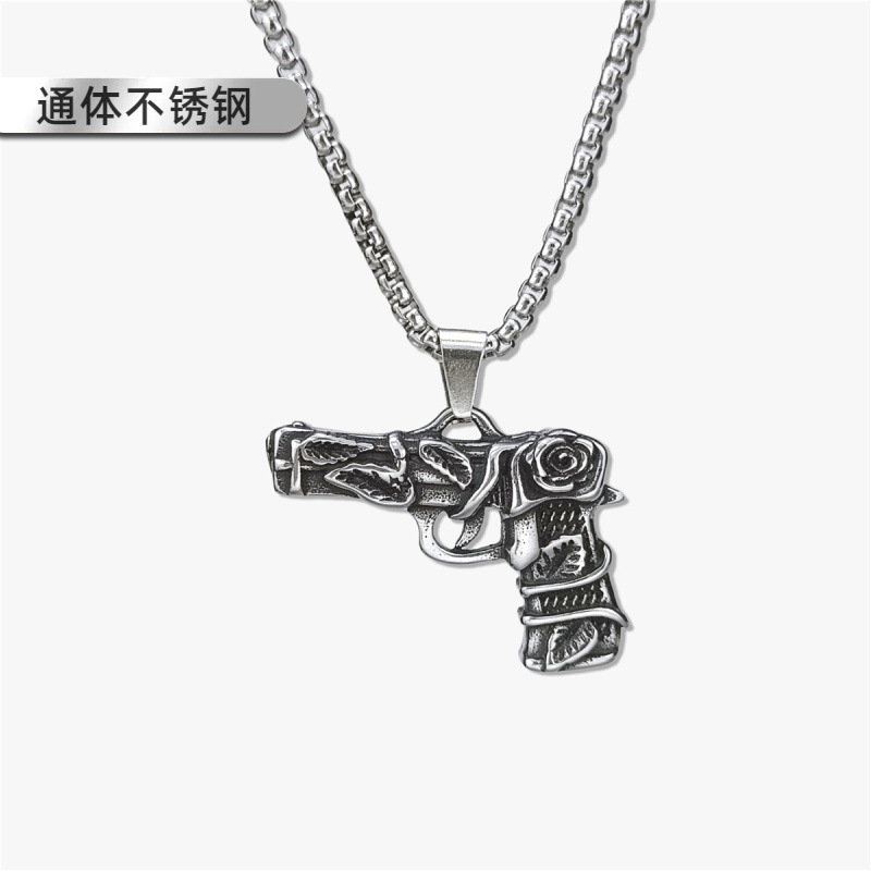 欧米の国境を越えた新型バラ薔薇ピストルチタン鋼ペンダント潮男パンクアメリカ銃形ネックレス卸売り