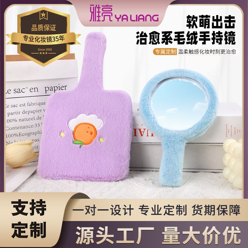 ラウンドスクエア毛皮のような刺繍ハンドルミラープラスチックハンドルミラーと豪華なカバー美容ミラーポータブルミラー