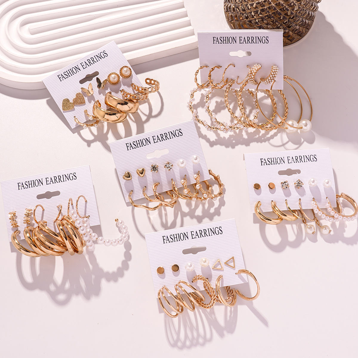 国境を越えて人気のある金属麻花イヤリングセットのアイデアは真珠の耳輪の幾何学的なイヤリングをはめ込んでいます。
