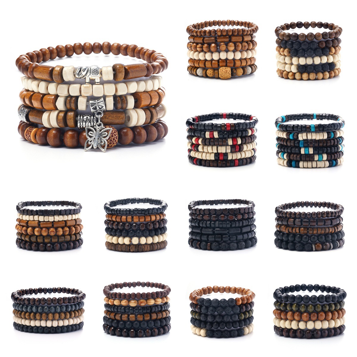 アマゾンのクロスボーダーの人気男性の復古風の多いセットの弾力線の木の玉の手作りの数珠の手の飾り