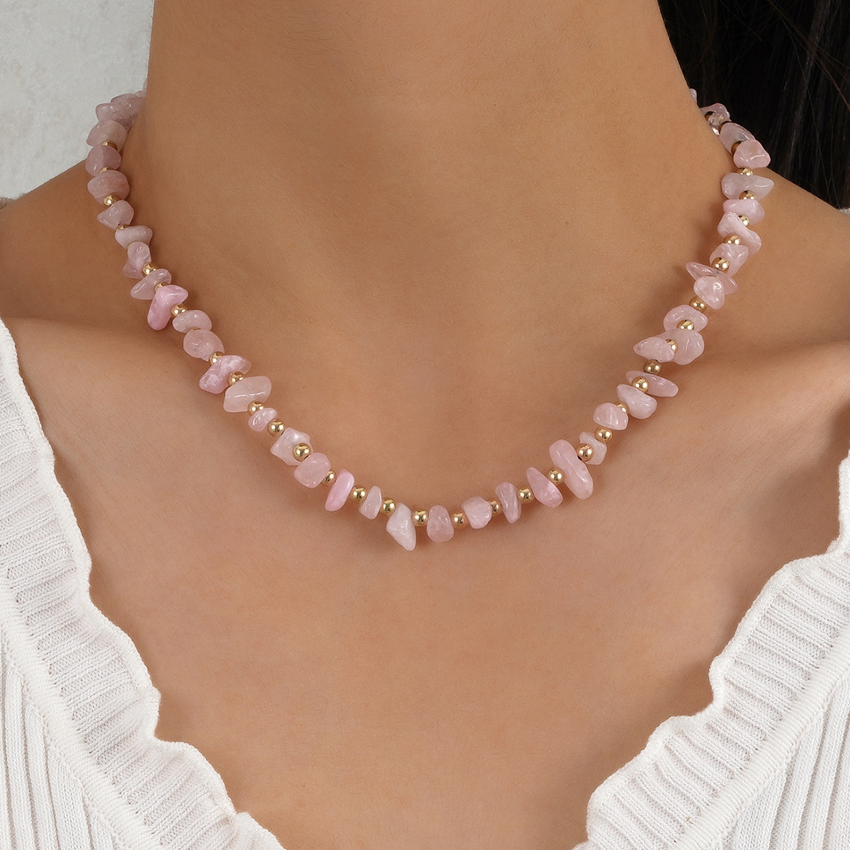 おしゃれでシンプルな通勤基礎タイプのピンクの砂利の不規則な石の銀色の小さいボールの女性のネックレス