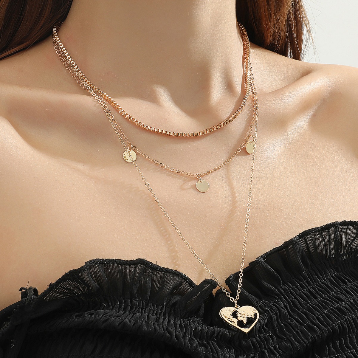 国境を越えた新しいバレンタインデープレゼントの四角い箱チェーンの幾何学的な丸いペンダント愛地図ペンダント多層ネックレス