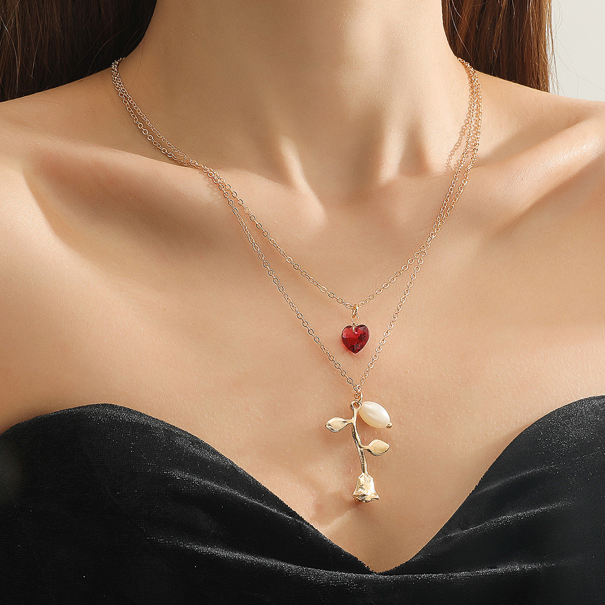 欧米の対外貿易の新型の精巧な細い鎖の赤いガラスの愛の真珠のバラの花のペンダントの清新で甘いネックレス