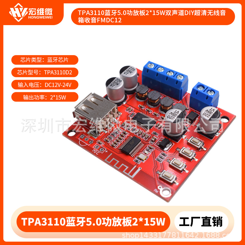 Tpa3110 bluetooth 5.0功放板2*15wダブルチャンネルdiy超清無線スピーカーラジオfmdc12