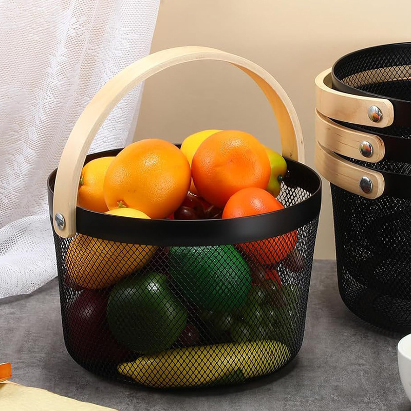 北欧鉄製ハンドギフト収納バスケットキッチン木製ハンドルルイシャトバスケット中空排水バスケット生産工場