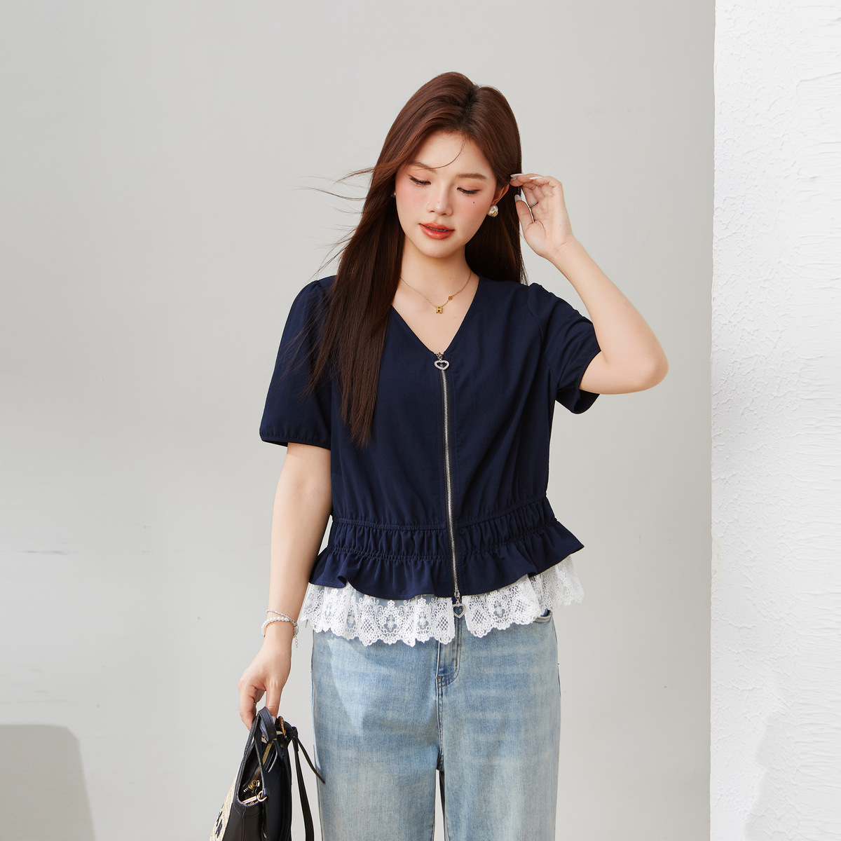 Caiduobao プラスサイズの女性のファット mm2025 夏の新しい年齢を減らすファッションレーススプライシングトップ EXA5532