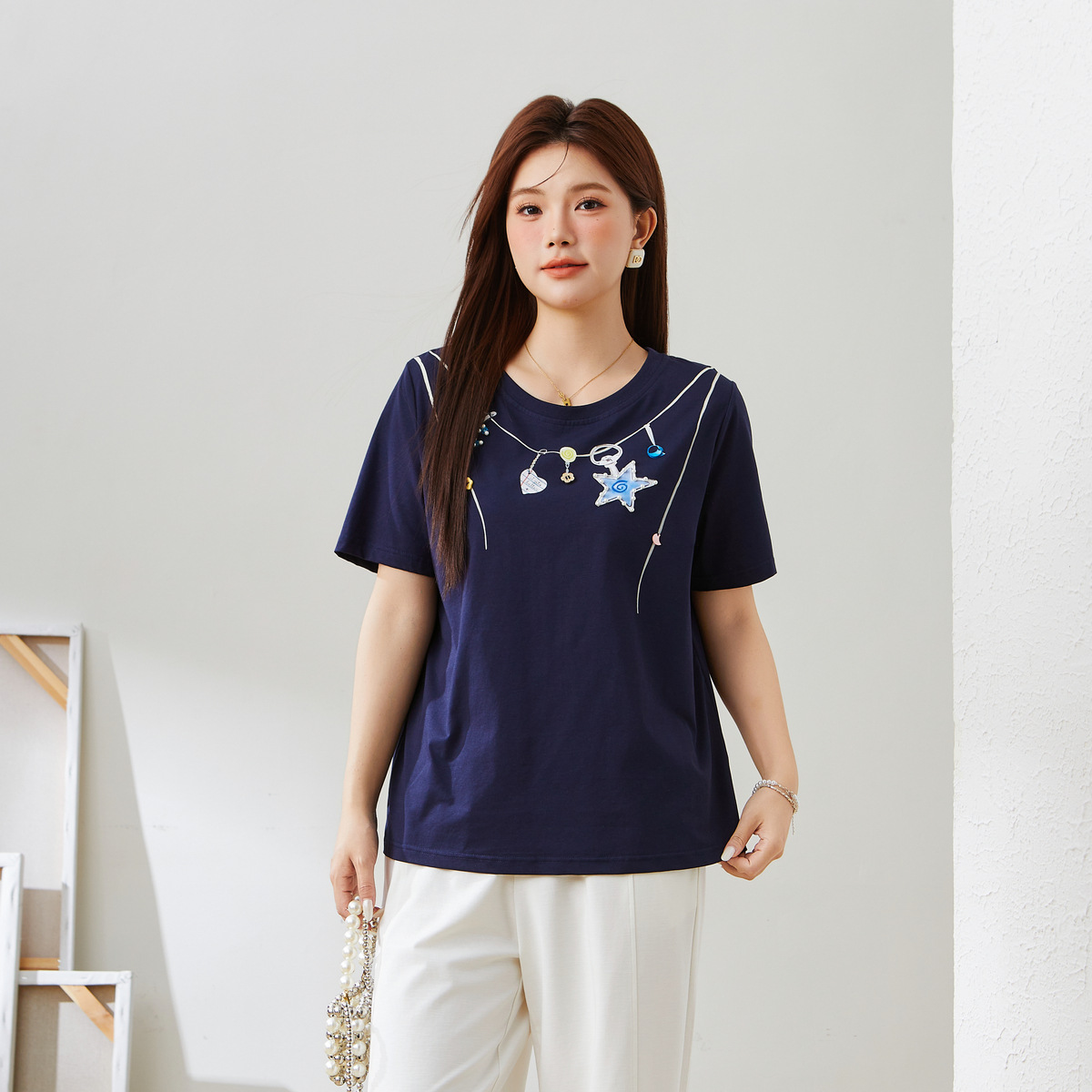 Caiduobao プラスサイズの女性のファット mm2025 夏の新しいスタイル星空プリント手作りビーズ Tシャツ EXZ5533
