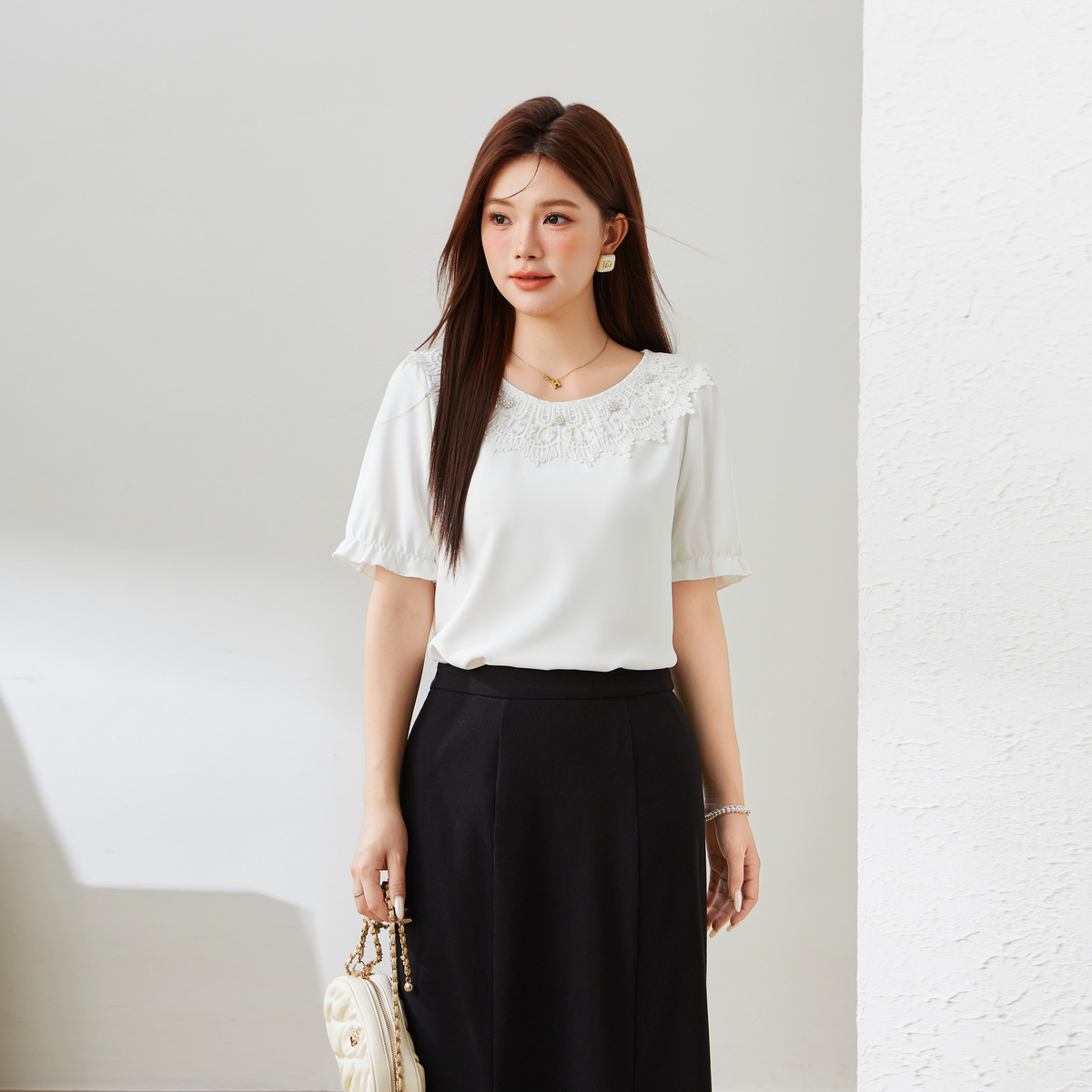 Caiduobao プラスサイズの女性のファット mm2025 夏の新レースビーズラウンドネックパフスリーブシャツ EXA5513