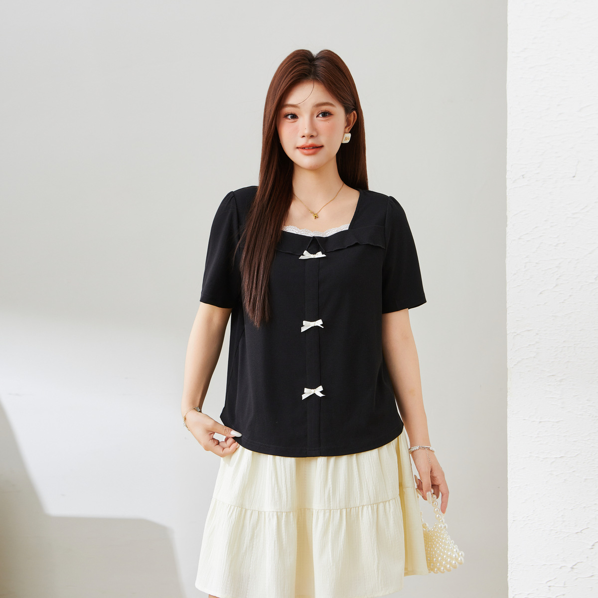 Caiduobao プラスサイズの女性のファット mm2025 夏の新しいスクエアネックレースステッチリボントップ EXZ5572