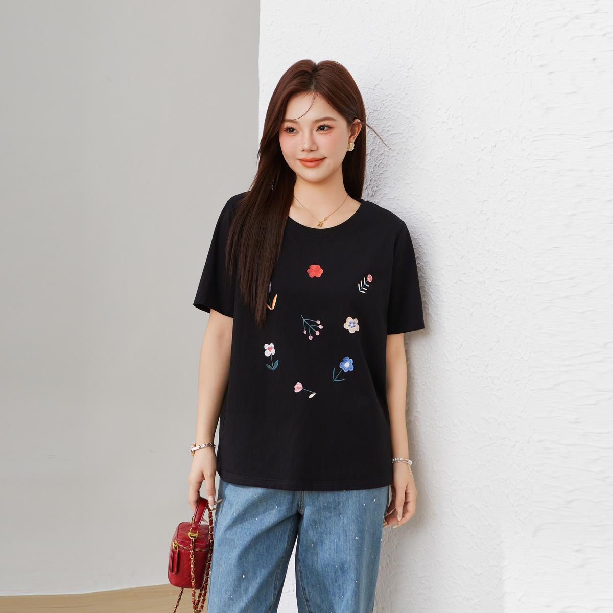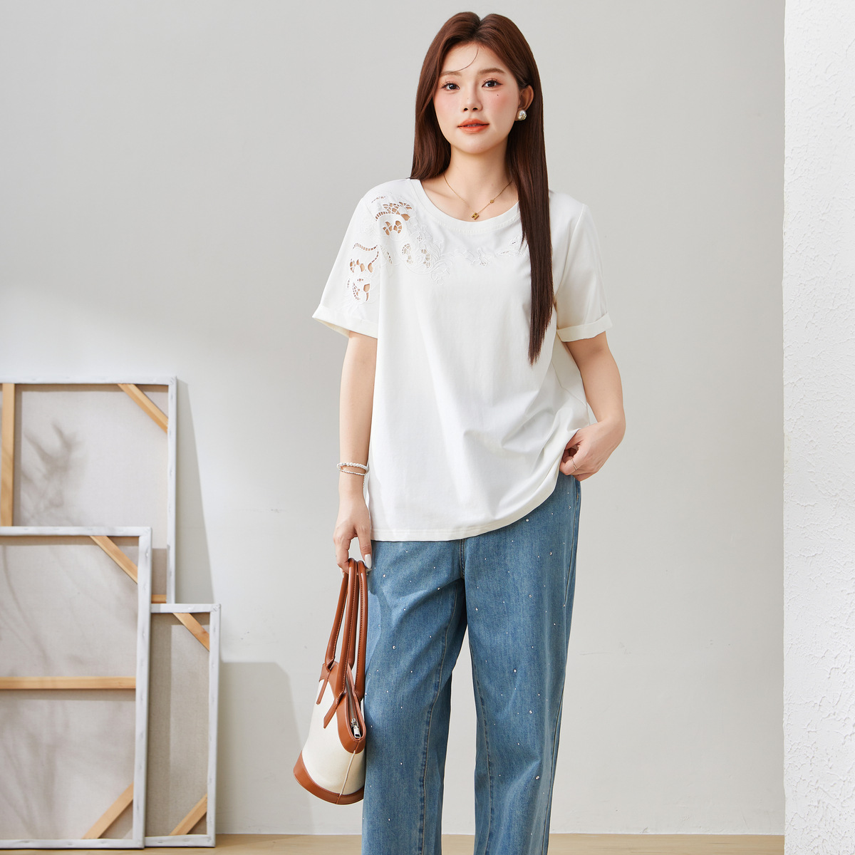 Caiduobao プラスサイズの女性のファット mm2025 夏の新しいラウンドネック中空刺繍ルーズトップ EXZ5571